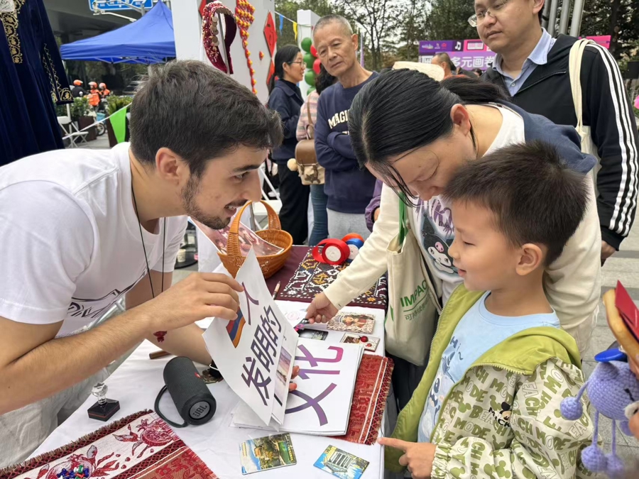 亚美尼亚展台被称为“最认真展台”,留学生李龙图文并茂地展示了亚美尼亚的文化、风景、发明等。“彩色电视、轮椅、核磁,这些都是亚美尼亚人发明的,你知道吗?”抽拉知识卡片的过程中,留学生李龙自豪地向居民和其他国家的留学生介绍道。他还带来了亚美尼亚传统服饰、头纱让大家现场试戴,“希望大家对亚美尼亚这个位于欧洲与亚洲交界的国家有更多了解。”