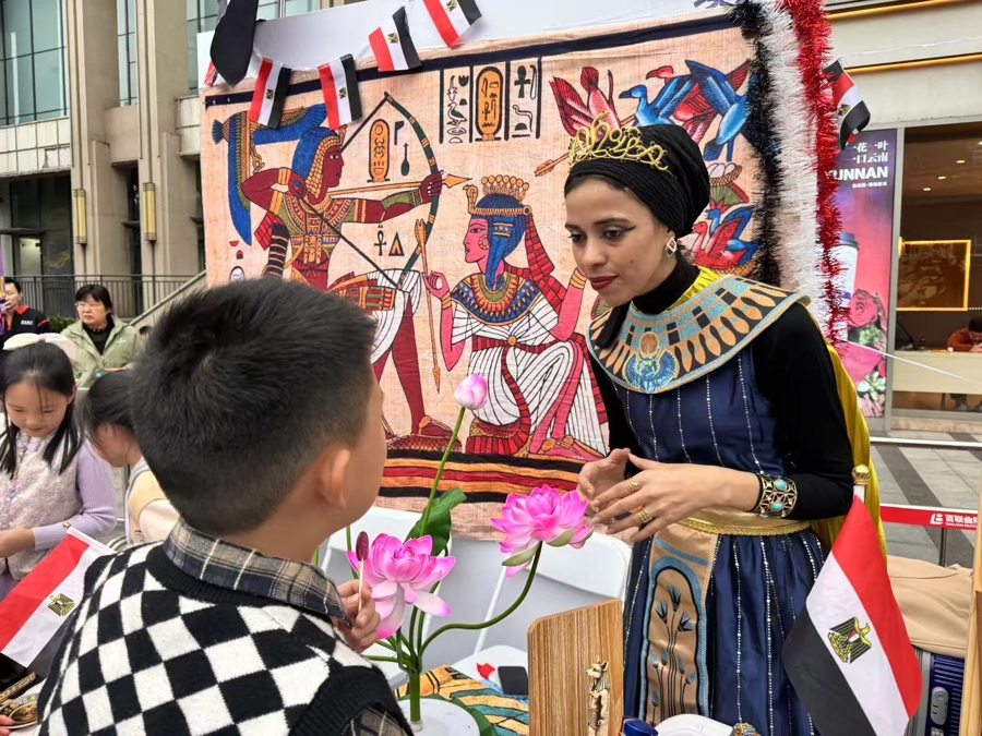 埃及留学生马晓玫化身“埃及艳后”向居民们介绍展台上手工艺品背后的埃及文化。 文汇报记者 单颖文摄