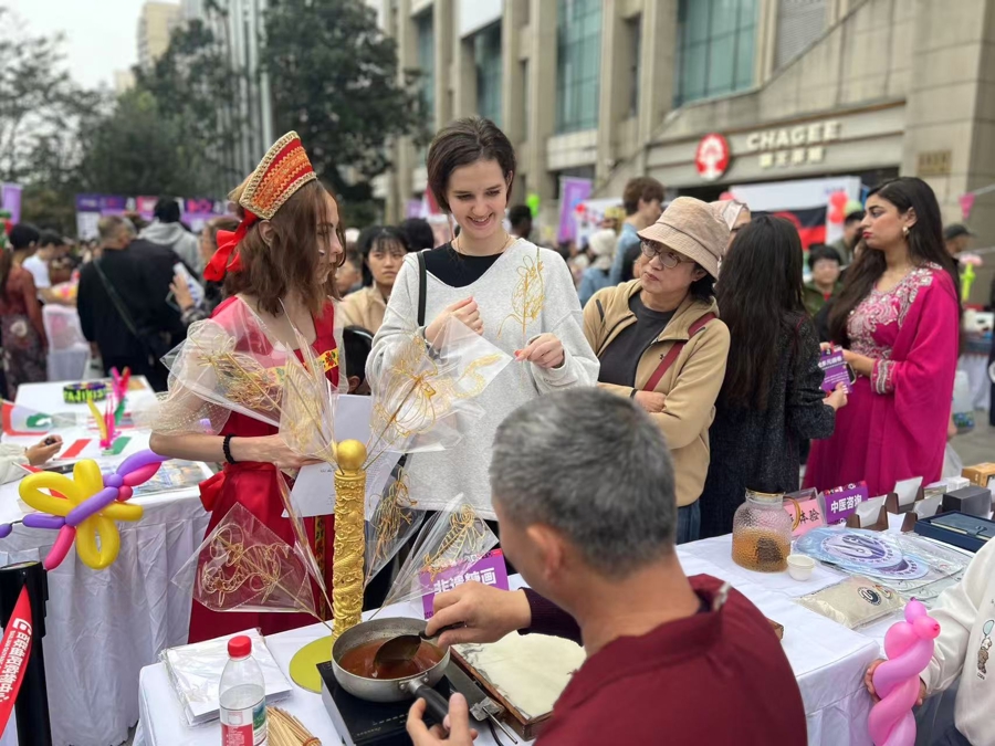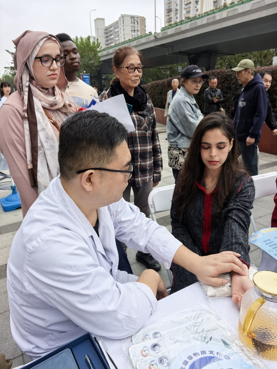 除了留学生带来的展台,现场还设置了非遗文化体验区、国际人才政策咨询区、社区卫生服务中心问诊区等。摩洛哥留学生包莉娜特地体验了中医诊脉,“医生把两根手指搭在我的手腕里侧几秒,就知道我有气血不足的问题。”不一会儿,她就呼朋唤友一起来到问诊区,“大家都觉得医生测得很准,中医真的太厉害了!”
