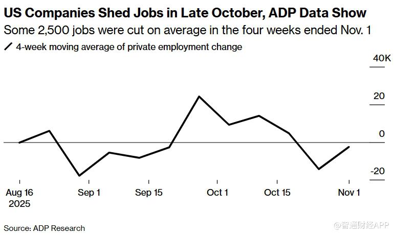 根据ADP Research周二发布的数据,截至11月1日的四周内,美国企业平均每周减少约2500个就业岗位。这表明劳动力市场在10月下旬失去了一定的动力。